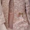 Le sac assorti, avec sa texture luxueuse façon cuir nacré, complète parfaitement la tenue pour offrir un look harmonieux et digne des plus belles occasions.